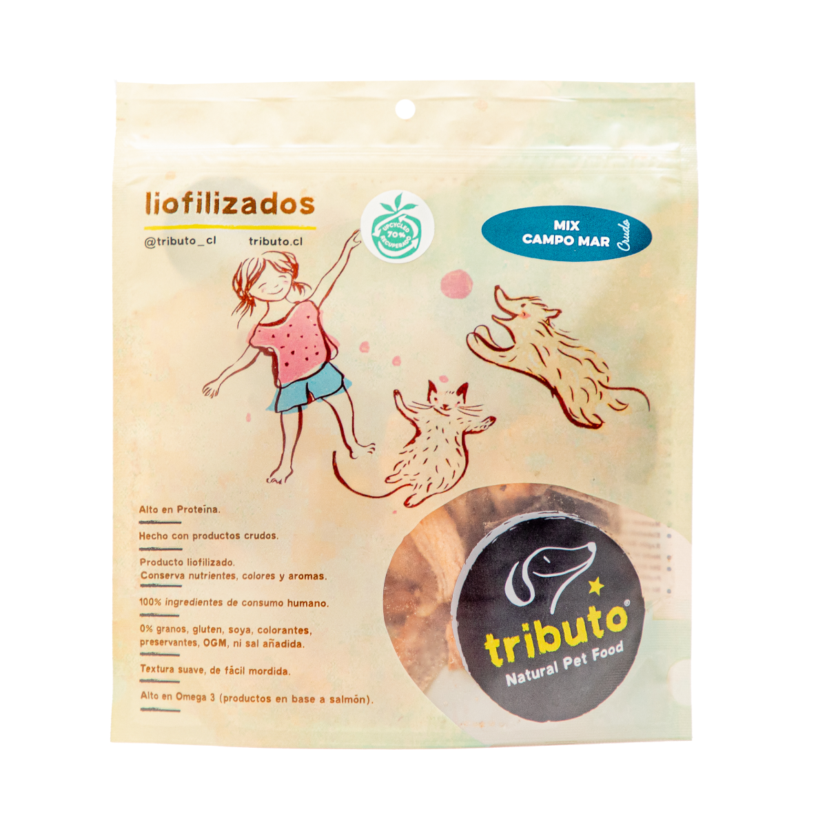 Los treats de Tributo Crudo Mix Campo Mar están formulados para complementar dietas naturales como BARF o usarse como topping funcional. Su perfil nutricional lo convierte en un refuerzo ideal para una dieta sana y balanceada.