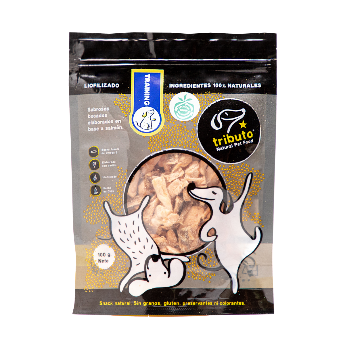 Los treats Tributo Training Salmón están formulados como snack funcional y saludable, ideal para usar durante sesiones de adiestramiento o como refuerzo ocasional, entregando sabor real y nutrición de alto valor biológico en cada mordida. Su perfil nutricional lo convierte en un refuerzo ideal para una dieta sana y balanceada.